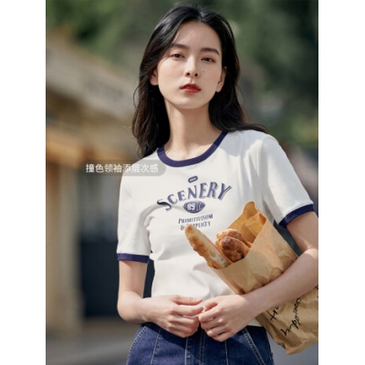 茵曼印花圆领T恤女夏季新款套头潮趣修身显...