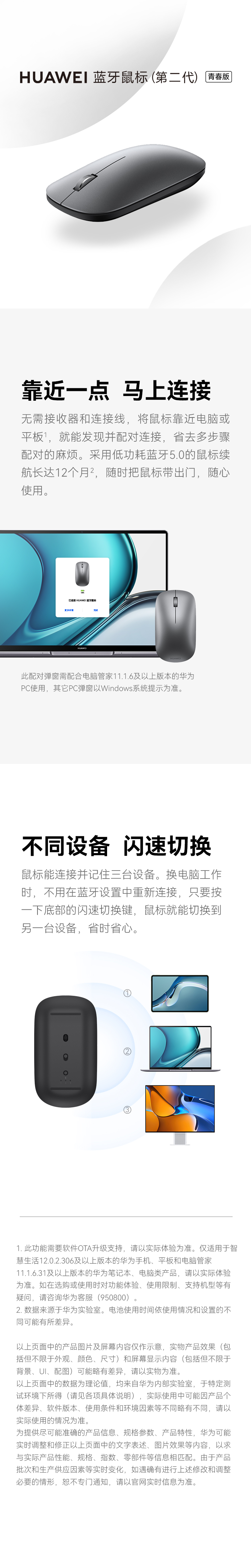 华为蓝牙鼠标(第二代)青春版 无线鼠标 台式机笔记本鼠标 适配MateBook全系笔记本电脑 灰色